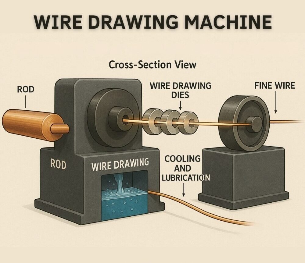 In this step, the thick steel rod is passed through machines that have small holes (called dies). Every time the rod passes through a die, it becomes thinner and hard.