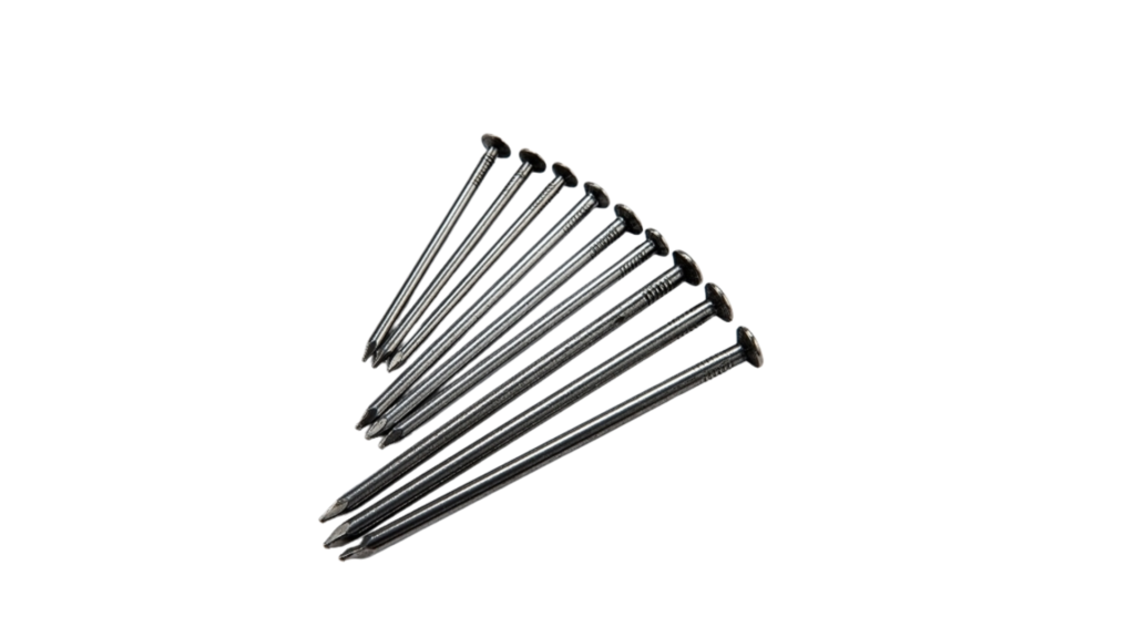 Nails are strong enough for construction but mainly for lighter work. They are commonly used in wooden frames, furniture, and small building tasks where they can hold materials together strongly.
